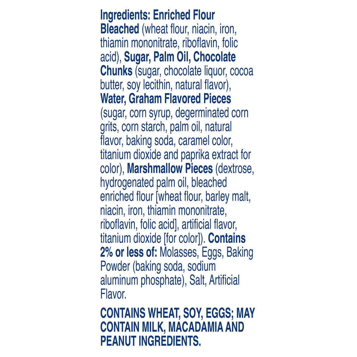 Enriched Flour Bleached (Wheat Flour, Niacin, Iron, Thiamin Mononitrate, Riboflavin, Folic Acid), Sugar, Palm Oil, Chocolate Chunks (Sugar, Chocolate Liquor, Cocoa Butter, Soy Lecithin, Natural Flavor…