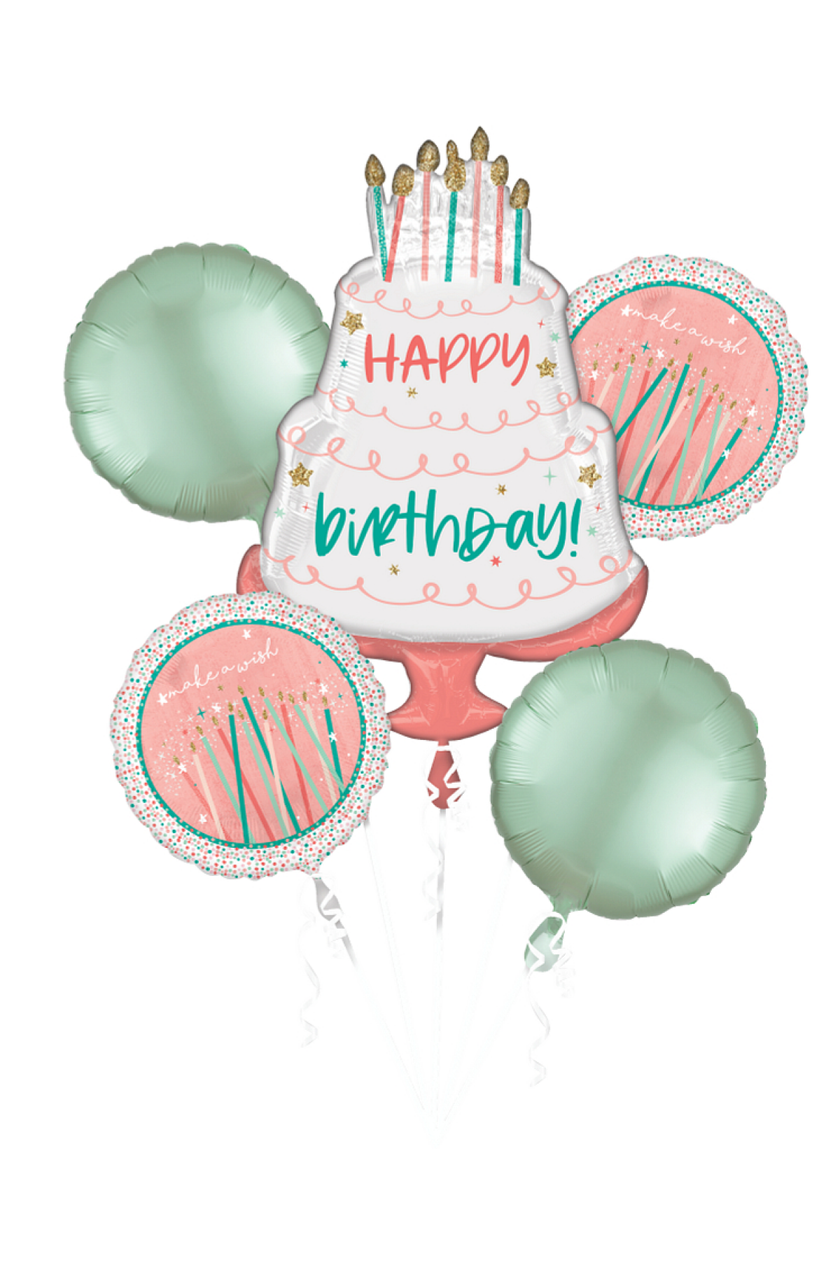 Add a pop of sweet pastel color your birthday decor with a balloon bouquet. This set of five foil balloons features a large twotier birthday cake balloon as the centerpiece with a Happy Birthday messa…