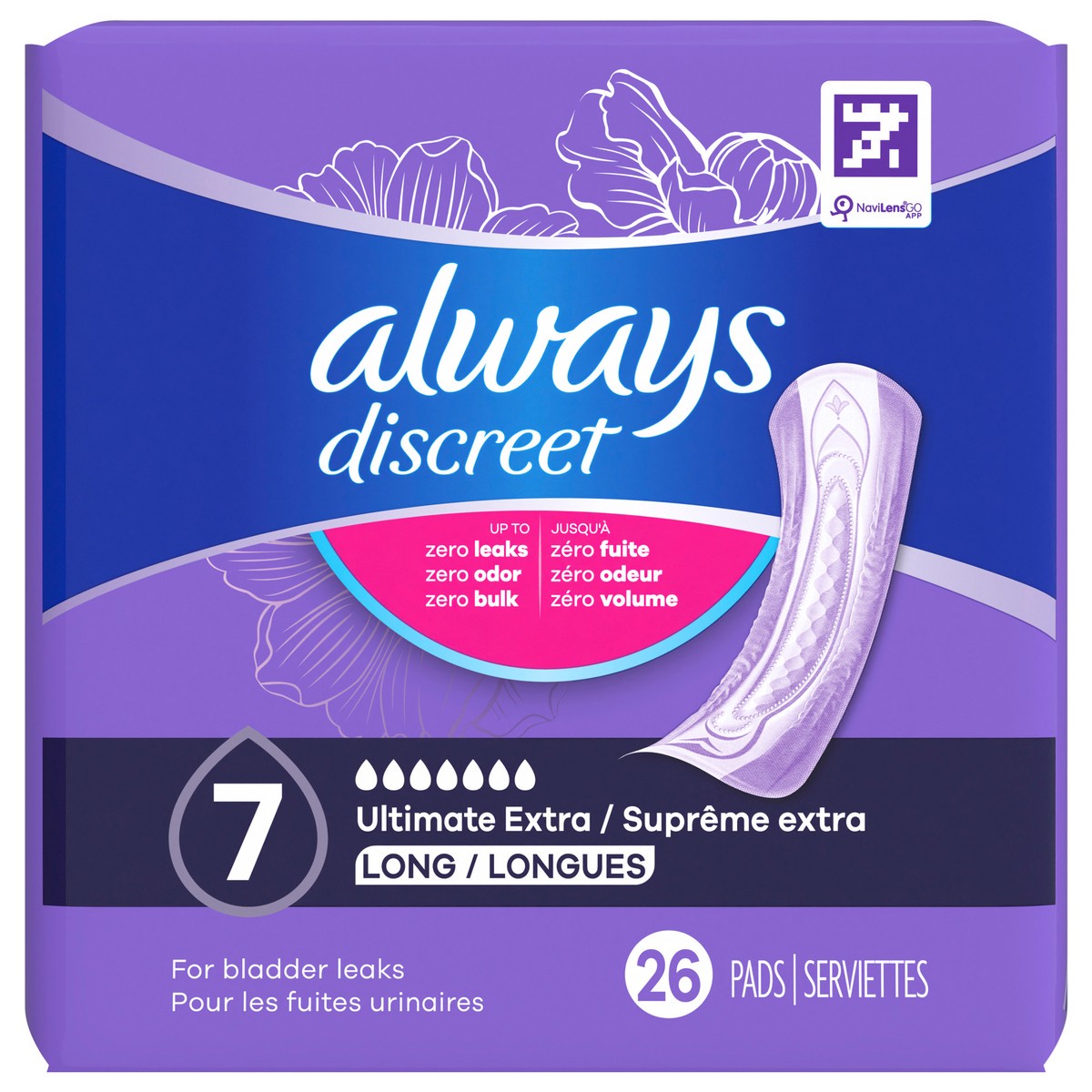 Always Discreet Adult Incontinence Pads for Women, Ultimate Extra Absorbency, Long Length, Postpartum Pads, 26 CT