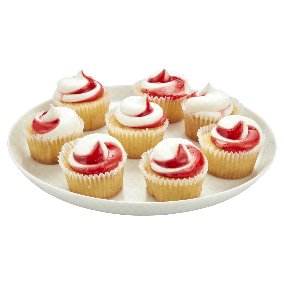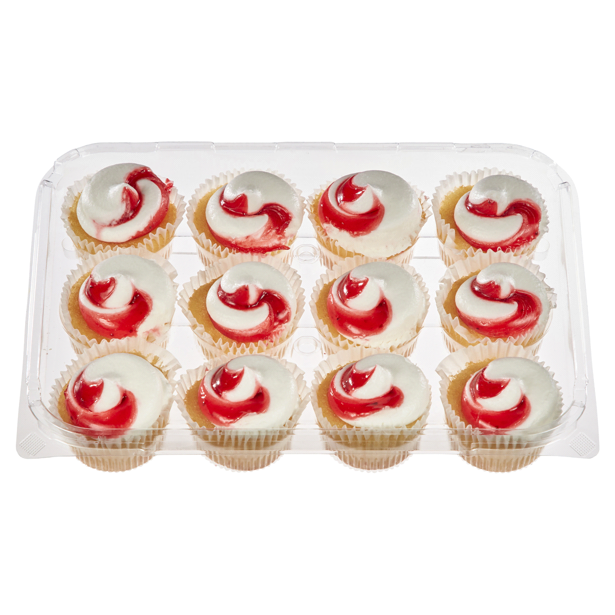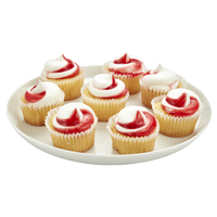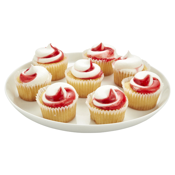 Naturally and Artificially flavored Mini Strawberry Shortcake Cupcakes with strawberry swirl and filling.