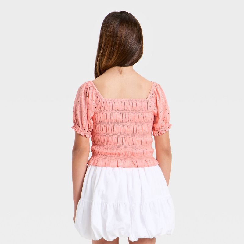 Girls' Short Sleeve Eyelet Smocked Top - Cat & Jack™ Coral Pink M