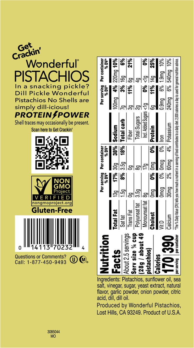 Gluten-free. Halal. Non-GMO Project verified. nongmoproject.org. No shells. Get crankin'. Woderful pistachios. In a snacking pikle? dill pickle wonderful pistachios no shells are simply dill-icious! P…