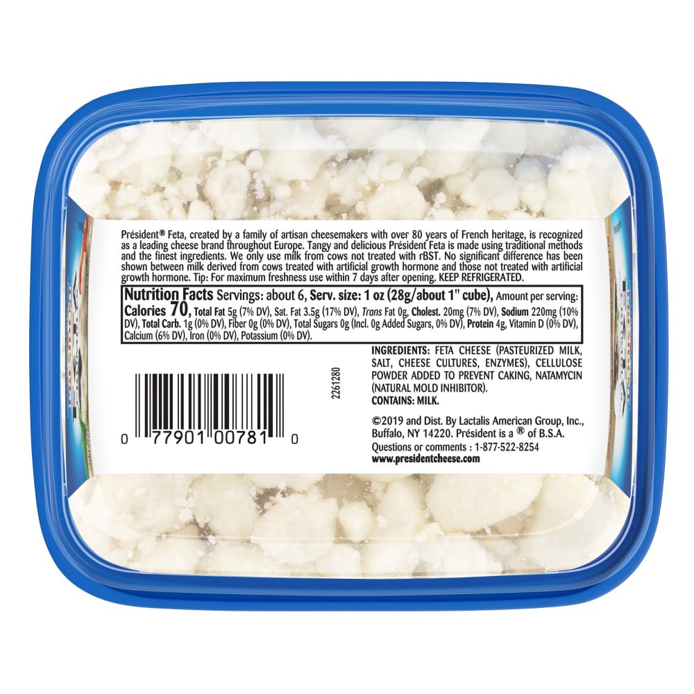 Feta Cheese (Pasteurized Milk, Salt, Cheese Cultures, Enzymes), Cellulose Powder Added to Prevent Caking, Natamycin (Natural Mold Inhibitor).