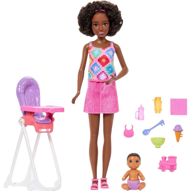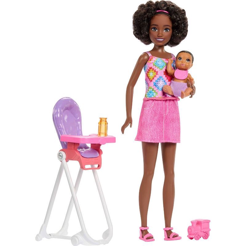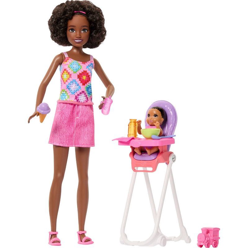 - This set inspires sweet storytelling with Skipper doll and a little one for her to care for -- they're ready for a midday treat with a high chair and yummy snacks.