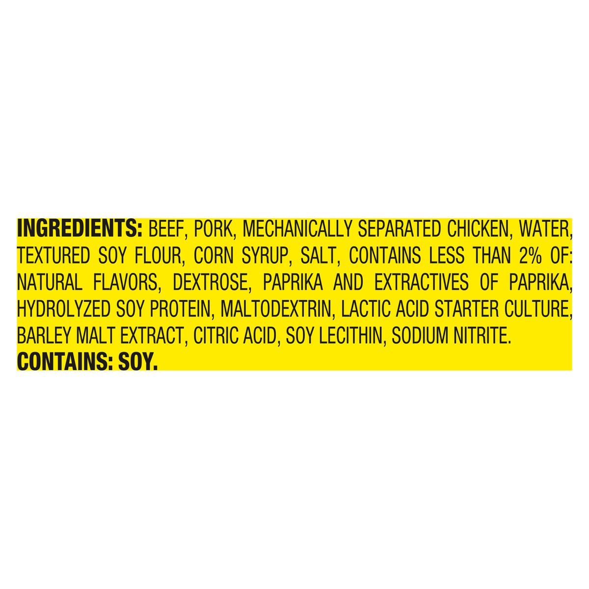 Beef, Pork, Mechanically Separated Chicken, Water, Textured Soy Flour, Corn Syrup, Salt, Contains less than 2% of: Natural Flavors, Dextrose, Paprika and Extractives of Paprika, Hydrolyzed Soy Protein…