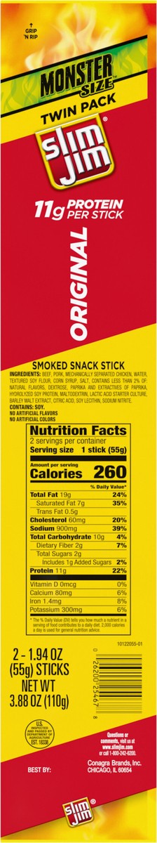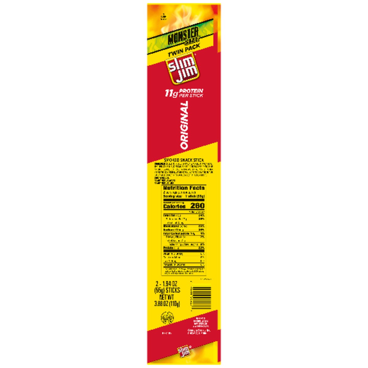 Satisfy your monster-sized cravings with Slim Jim Monster Size Twin Pack Original Smoked Snack Sticks. These monstrous meat sticks are made with beef and pork, as well as chicken, and pack 11 g of pro…