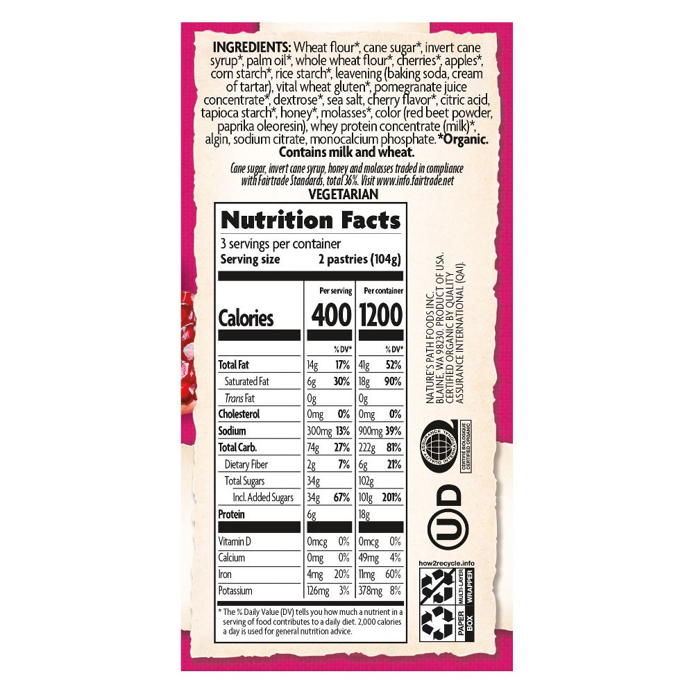 Nature's Path frosted cherry pomegranate organic toaster pastries contain a real organic cherry and pomegranate juice filling, encased in a lightly frosted organic pastry shell. You get 2 pastries per…