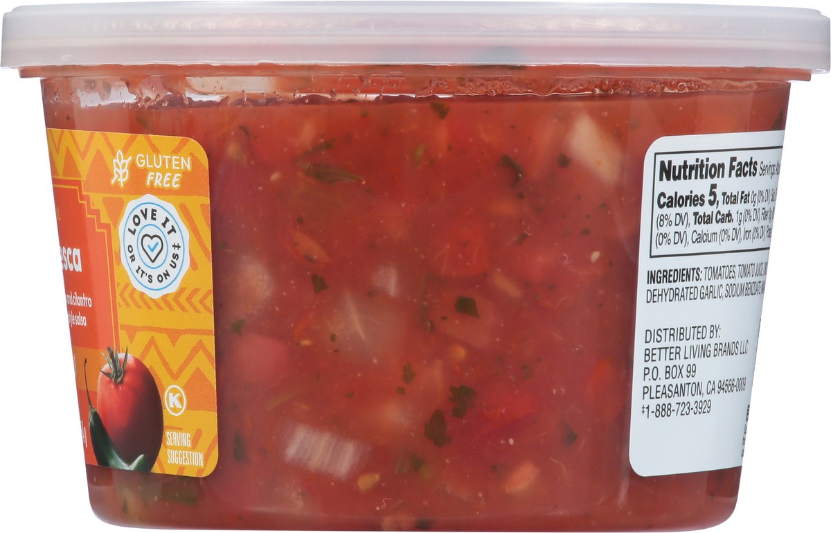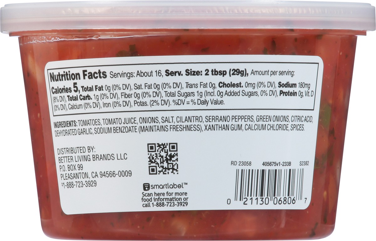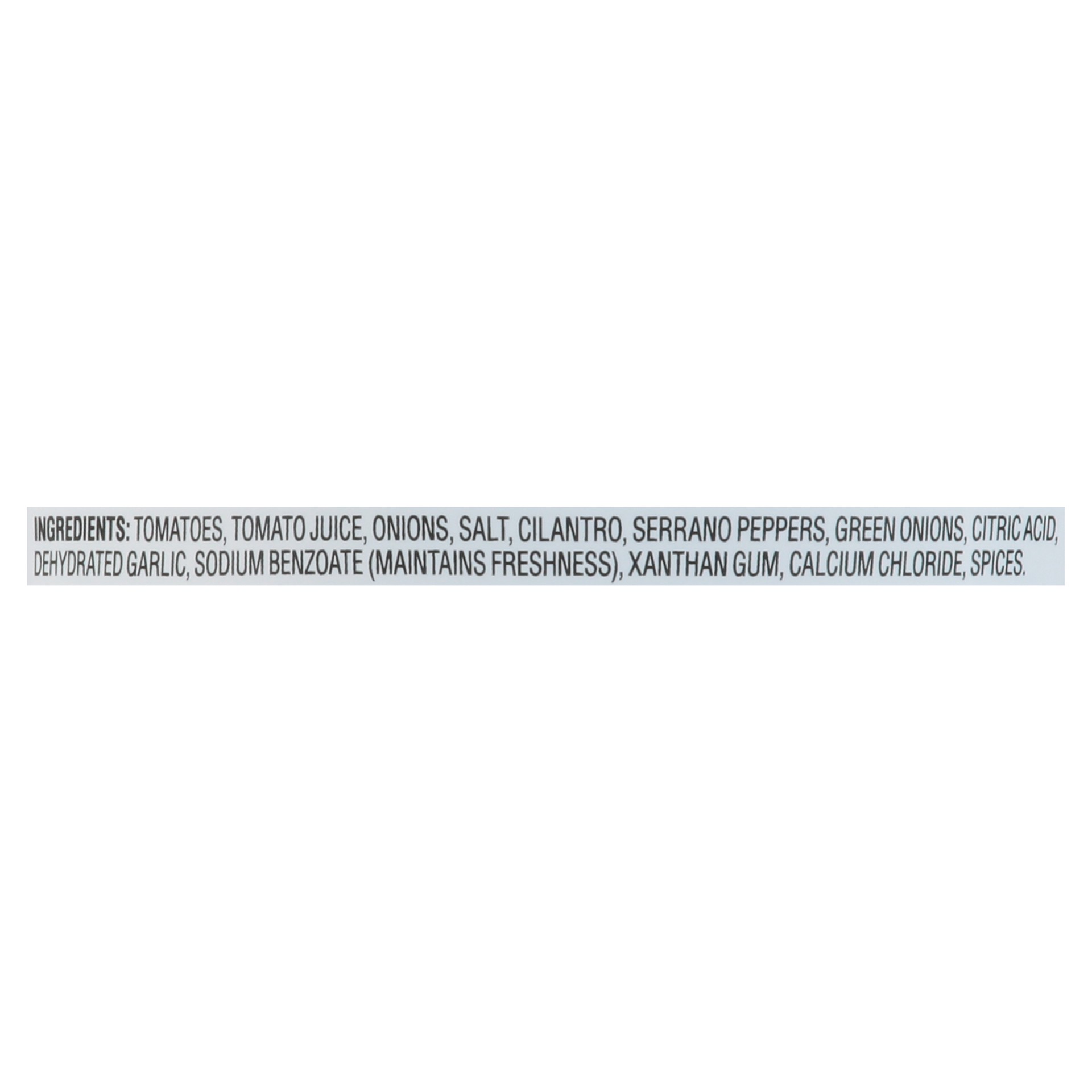 Tomatoes, Tomato Juice, Onions, Salt, Cilantro, Serrano Peppers, Green Onions, Citric Acid, Dehydrated Garlic, Sodium Benzoate (Maintains Freshness), Xanthan Gum, Calcium Chloride, Spices.