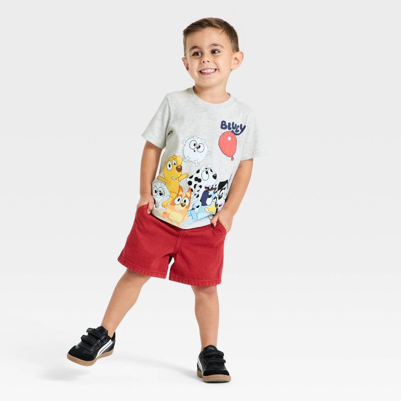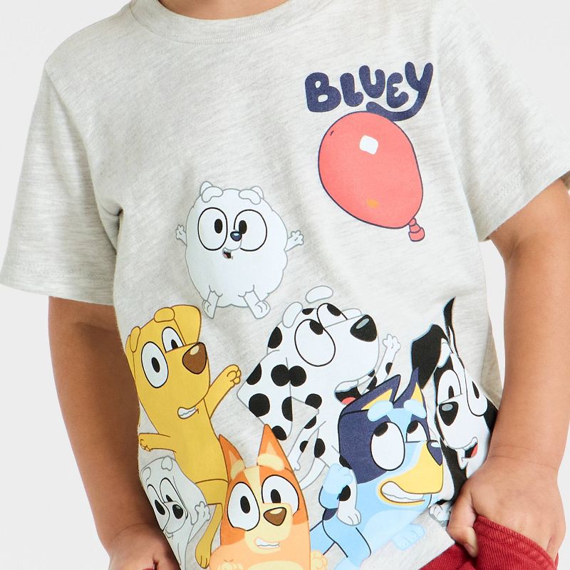 - Heather gray hue with graphic of Bluey, Bingo and their friends plus a balloon