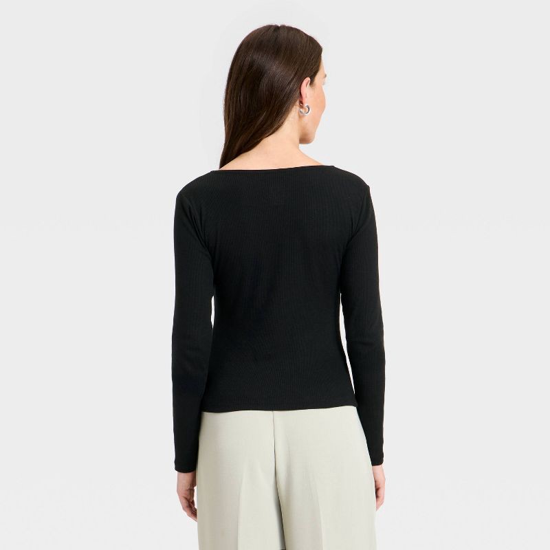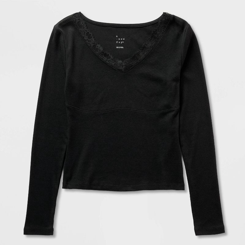Women's Lace Trim V-Neck Ribbed Top - A New Day™ Black M