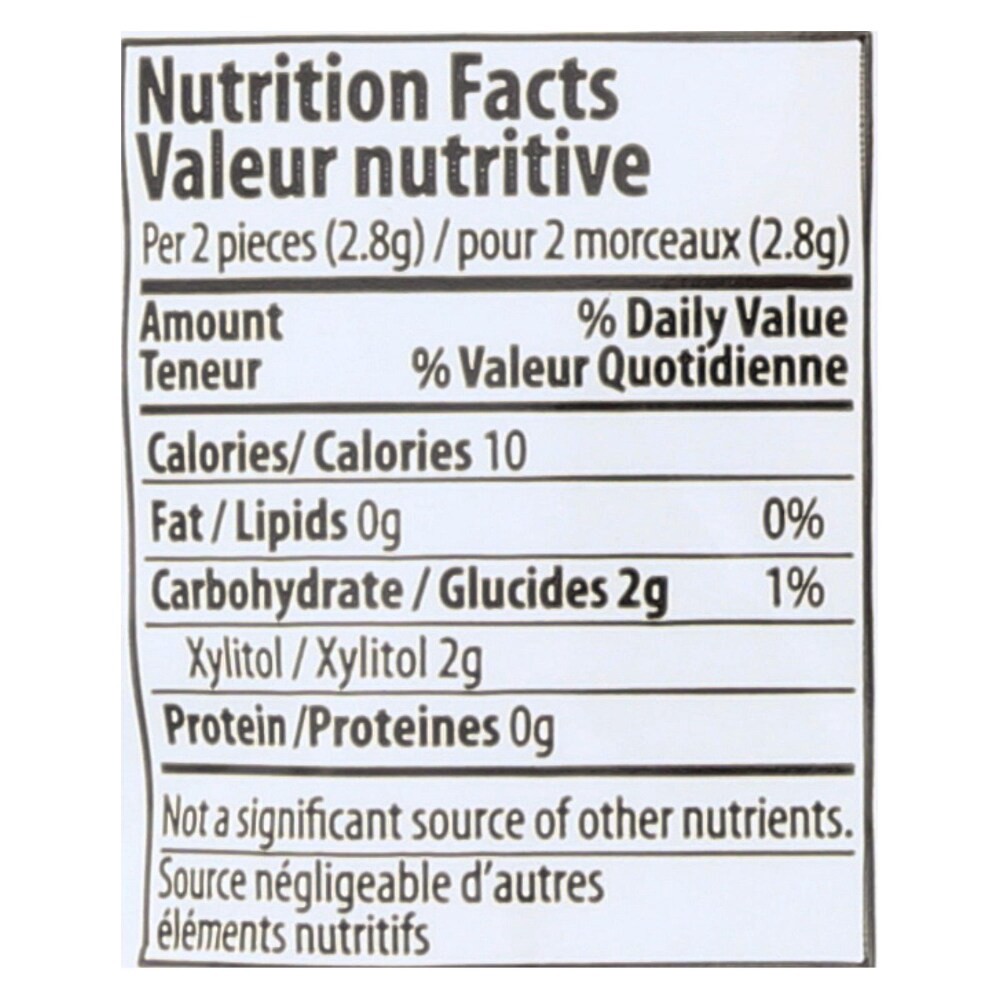 Xylitol, Gum Base, Gum Arabic, Glycerol, Natural Flavors, Carnauba Wax, Tocopherols.