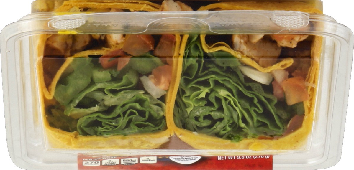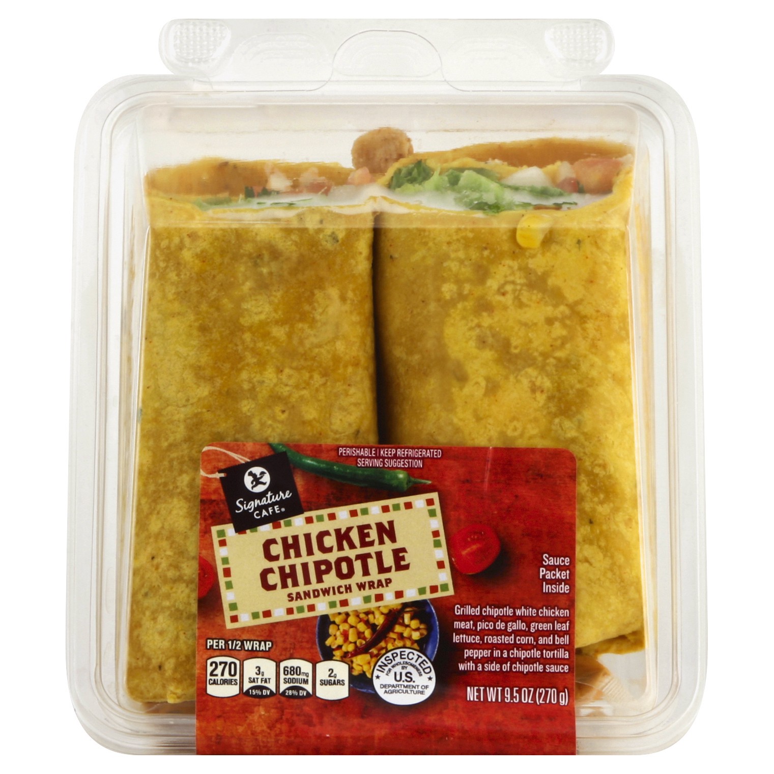 Per 1/2 Wrap: 270 calories; 3 g sat fat (15% DV); 680 mg sodium (28% DV); 2 g sugars. Sauce packet inside. Inspected for wholesomeness by US department of agriculture. Grilled chipotle chicken meat, p…