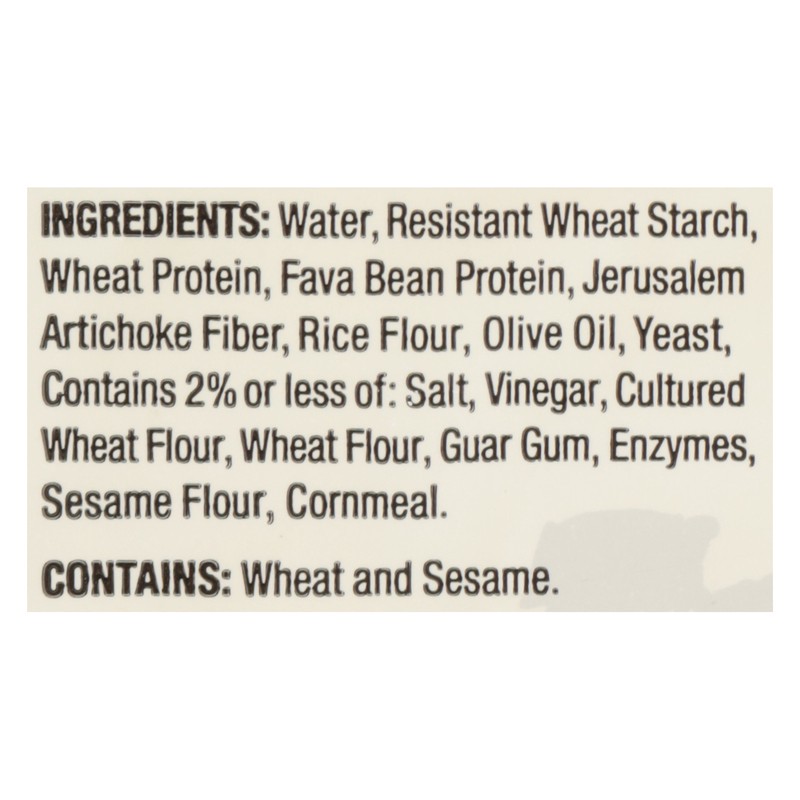 Water, Resistant Wheat Starch, Wheat Protein, Fava Bean Protein, Jerusalem Artichoke Fiber, Rice Flour, Olive Oil, Yeast, Contains 2% or Less of: Salt, Vinegar, Cultured Wheat Flour, Wheat Flour, Guar…