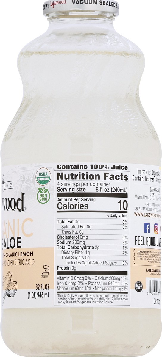 Inner leaf juice with organic lemon. USDA Organic. Certified Organic by Quality Certification Services (QCS). Latex & Aloin free (Contains less than 2ppm Aloin). 100% vegan. Gluten free. Allergen freeā¦