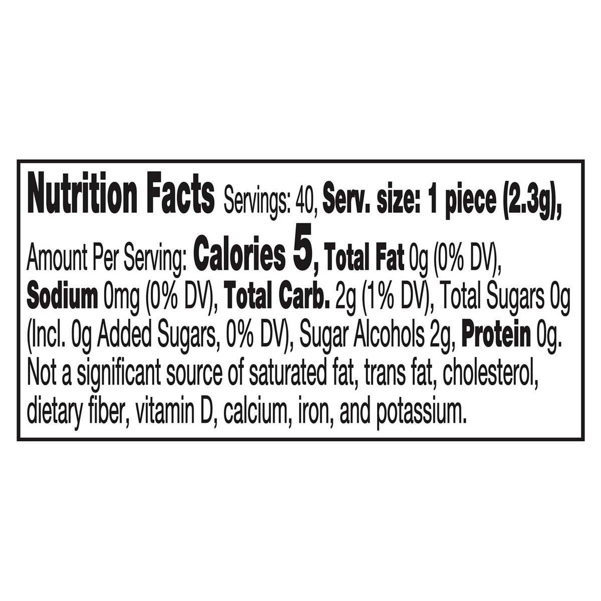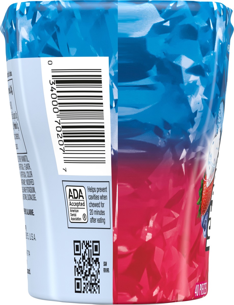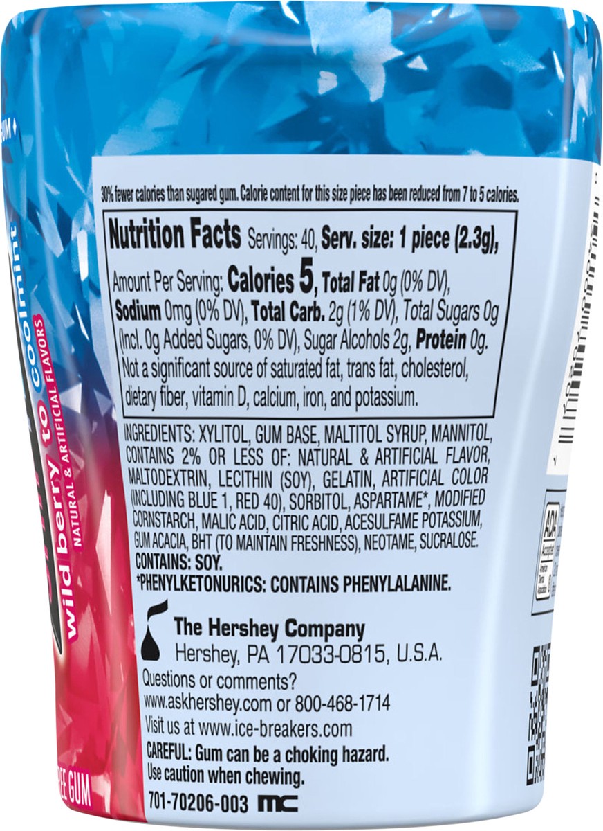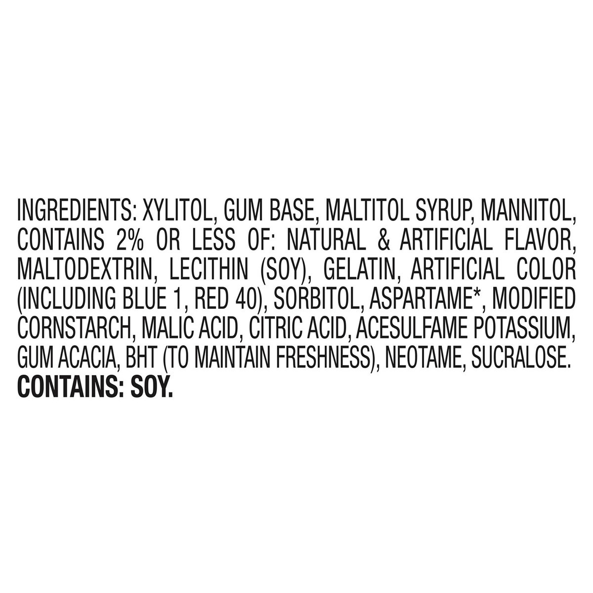 Xylitol, Gum Base, Maltitol Syrup, Mannitol, Contains 2% or Less of: Natural & Artificial Flavor, Maltodextrin, Lecithin (Soy), Gelatin, Artificial Color (Including Blue 1, Red 40), Sorbitol, Aspartam…
