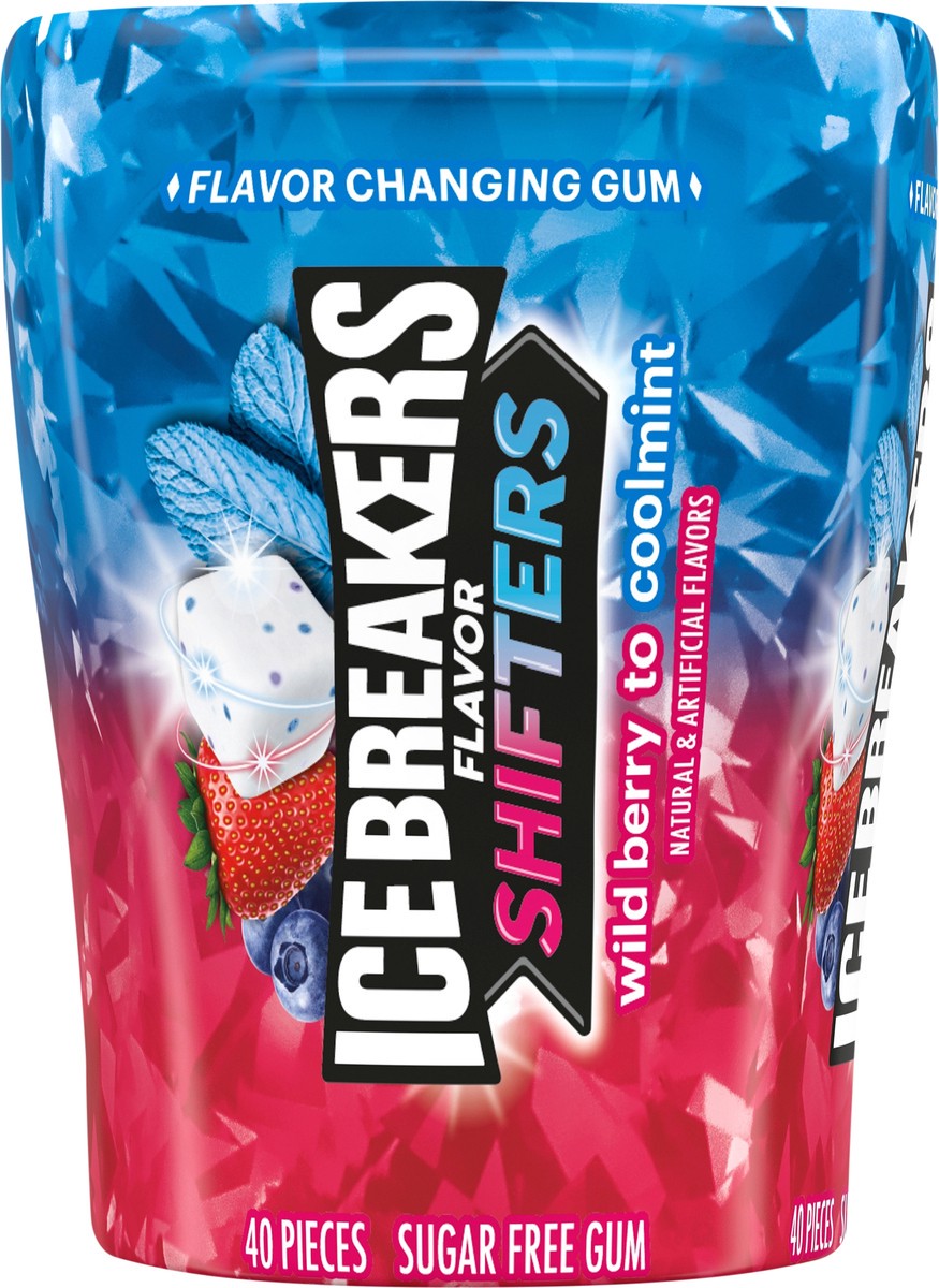 - 40-piece cube bottle filled with ICE BREAKERS FLAVOR SHIFTERS Wild Berry to Coolmint Flavored Sugar Free Chewing GumICE BREAKERS FLAVOR SHIFTERS chewing gum in a cube bottle is perfect for keeping in backpacks