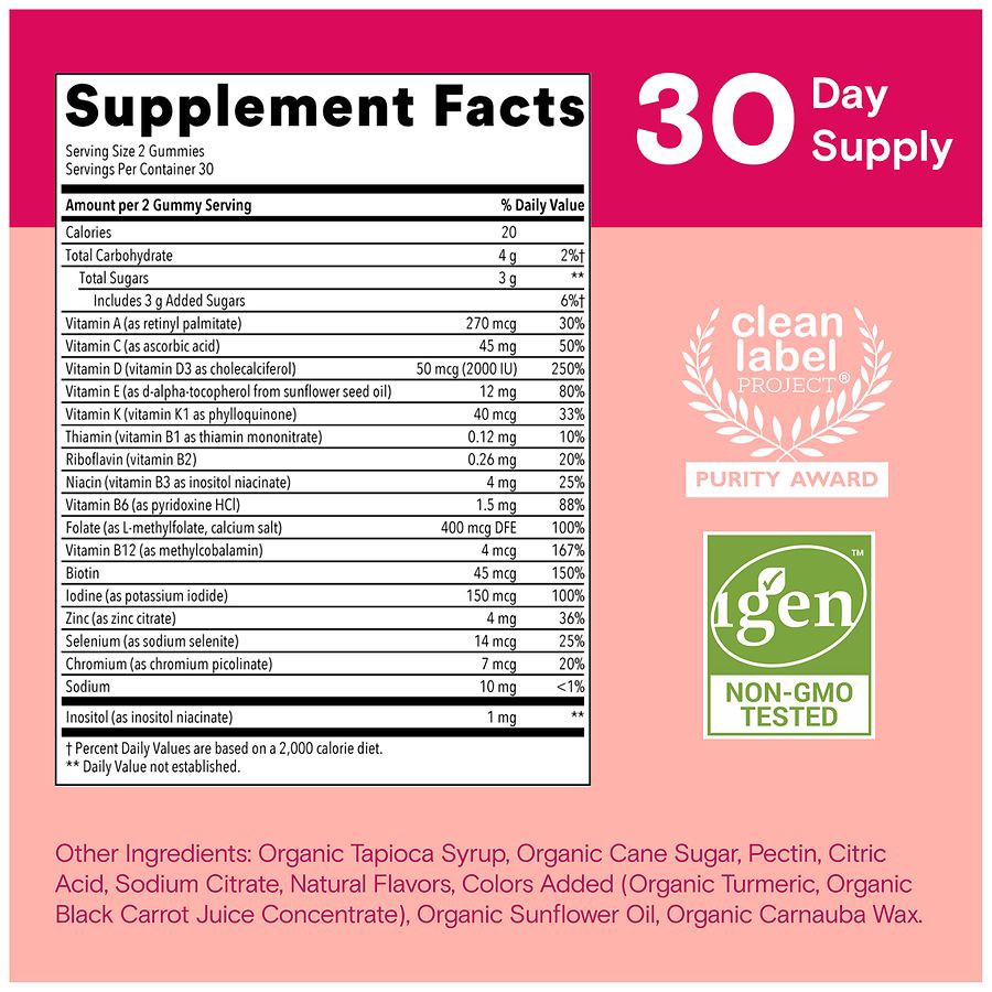 SmartyPants Womens Multi Gummies 60 ct other ingredients: Organic Tapioca Syrup, Organic Cane Sugar, Pectin, Citric Acid, Sodium Citrate, Natural Flavors, Colors Added (Organic Turmeric, Organic Blackā¦