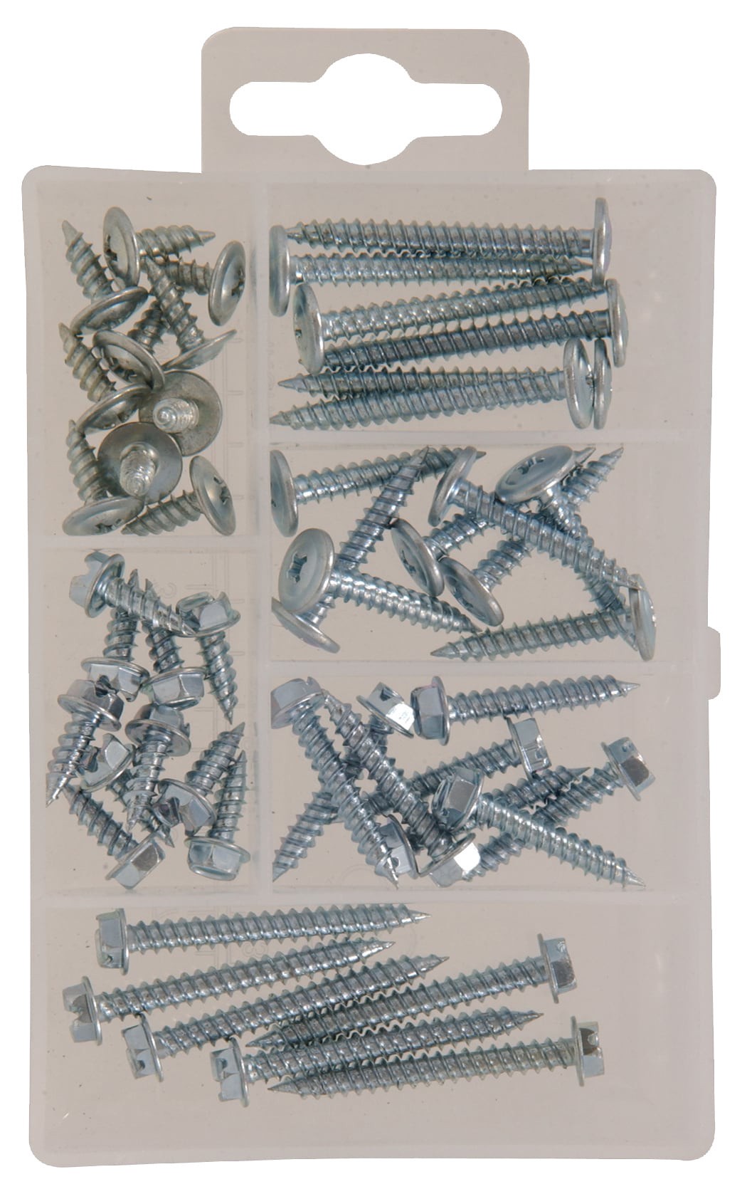 Can be used in overhead steel doors, hinges and latches. No pre-drilling is necessary. 48 piece kit.
