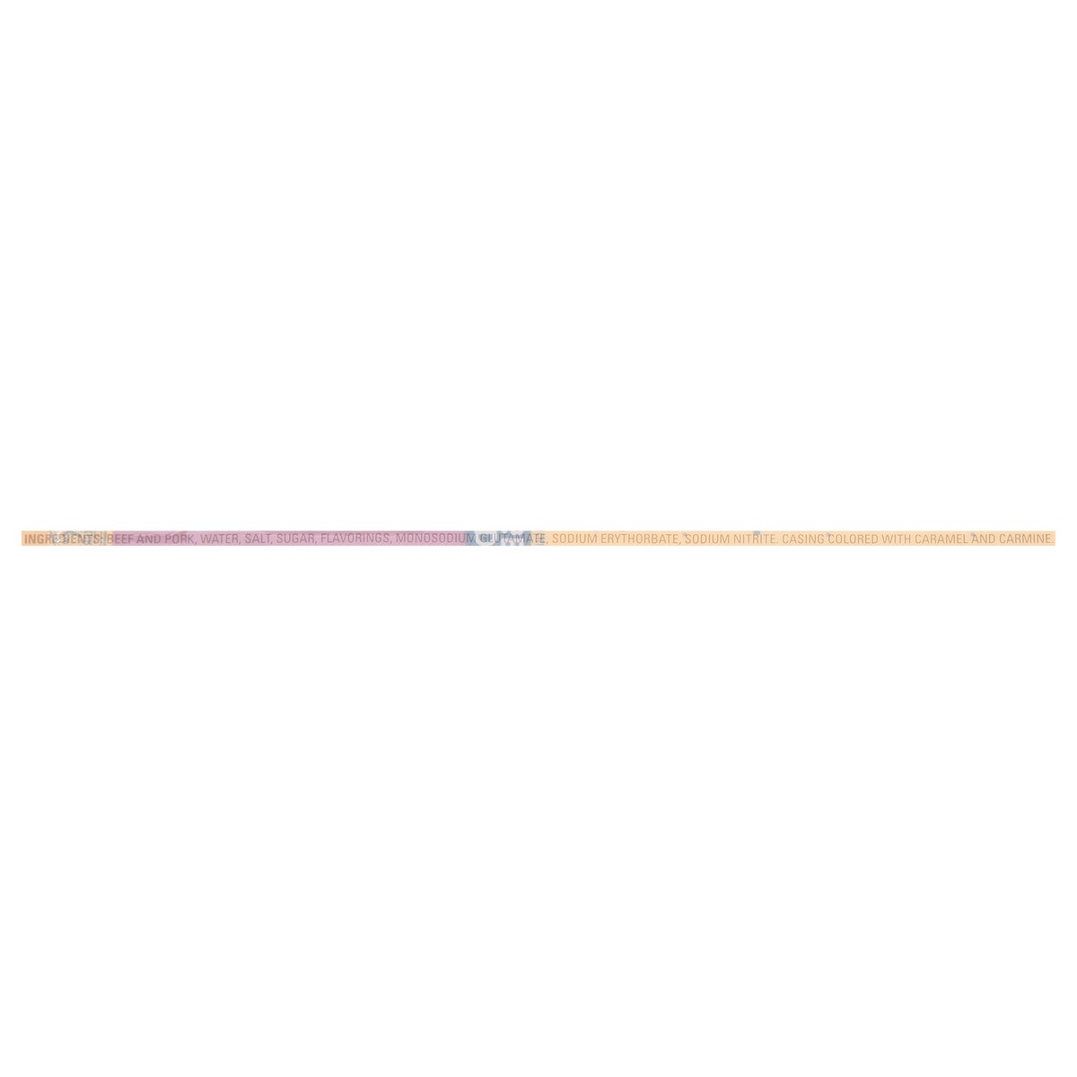 Beef and Pork, Water, Salt, Sugar, Flavorings, Monosodium Glutamate, Sodium Erythorbate, Sodium Nitrite, Casing Colored with Caramel and Carmine.