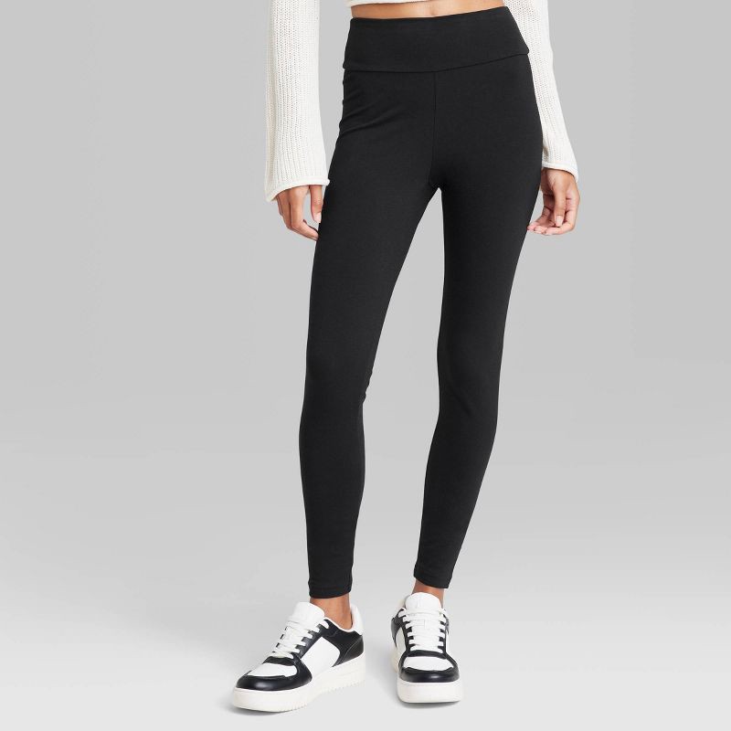 Women's black high-waisted leggings with cotton-blend construction for complete comfort. Wide waistband lends definitive detail along with the full-length design. Full waistband elastic lends addition…