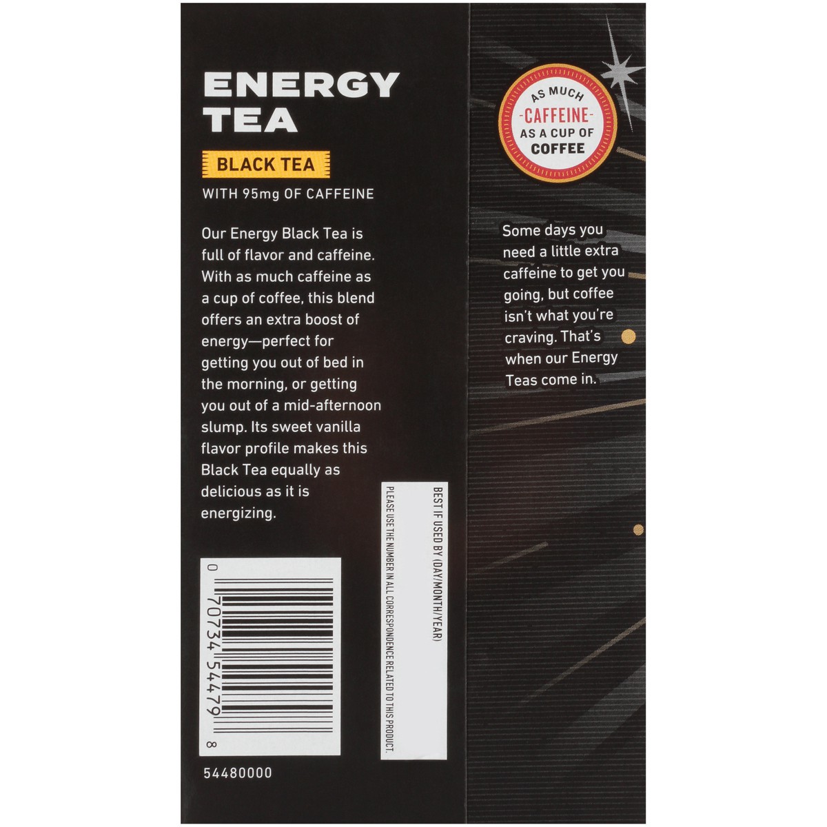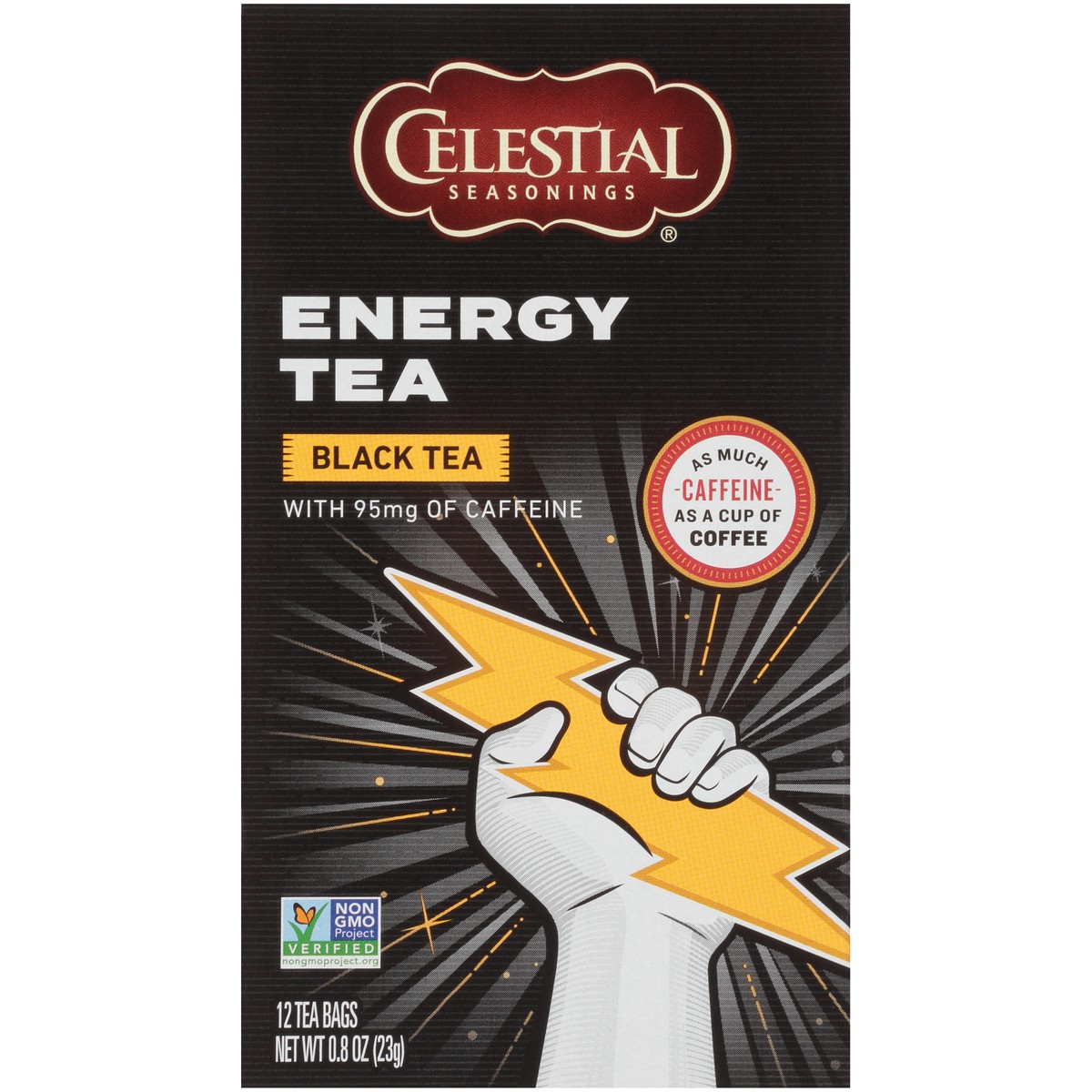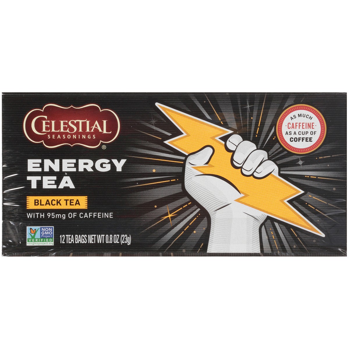 With 95 mg of caffeine. Certified Gluten free. gfco.org. Non GMO Project verified. nongmoproject.org. As much caffeine as a cup of coffee. Our energy black tea is full of flavor and caffeine. With as …