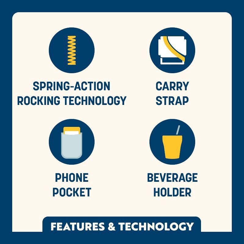 Features: Foldable, Rocking Motion, Armrests, Carrying Straps, Cup Holder, High Backs, Cell Phone Pocket