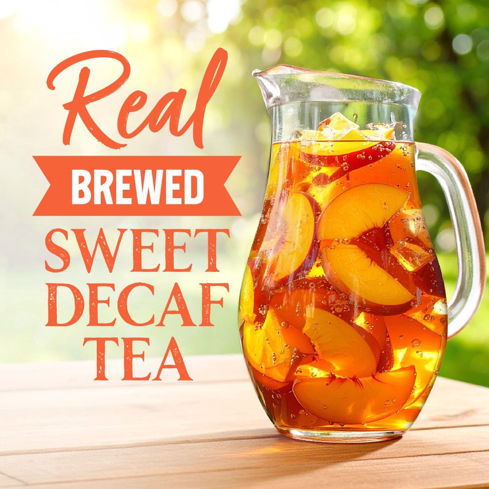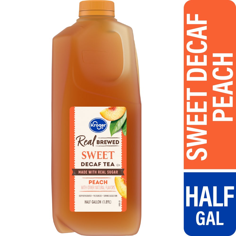 Kroger® Real Brewed Peach Sweet Decaf Tea fuses the charm of brewed decaf tea with luscious peach and other natural flavors. Decaffeinated, it's a soothing sip, anytime. Crafted with real sugar, it de…