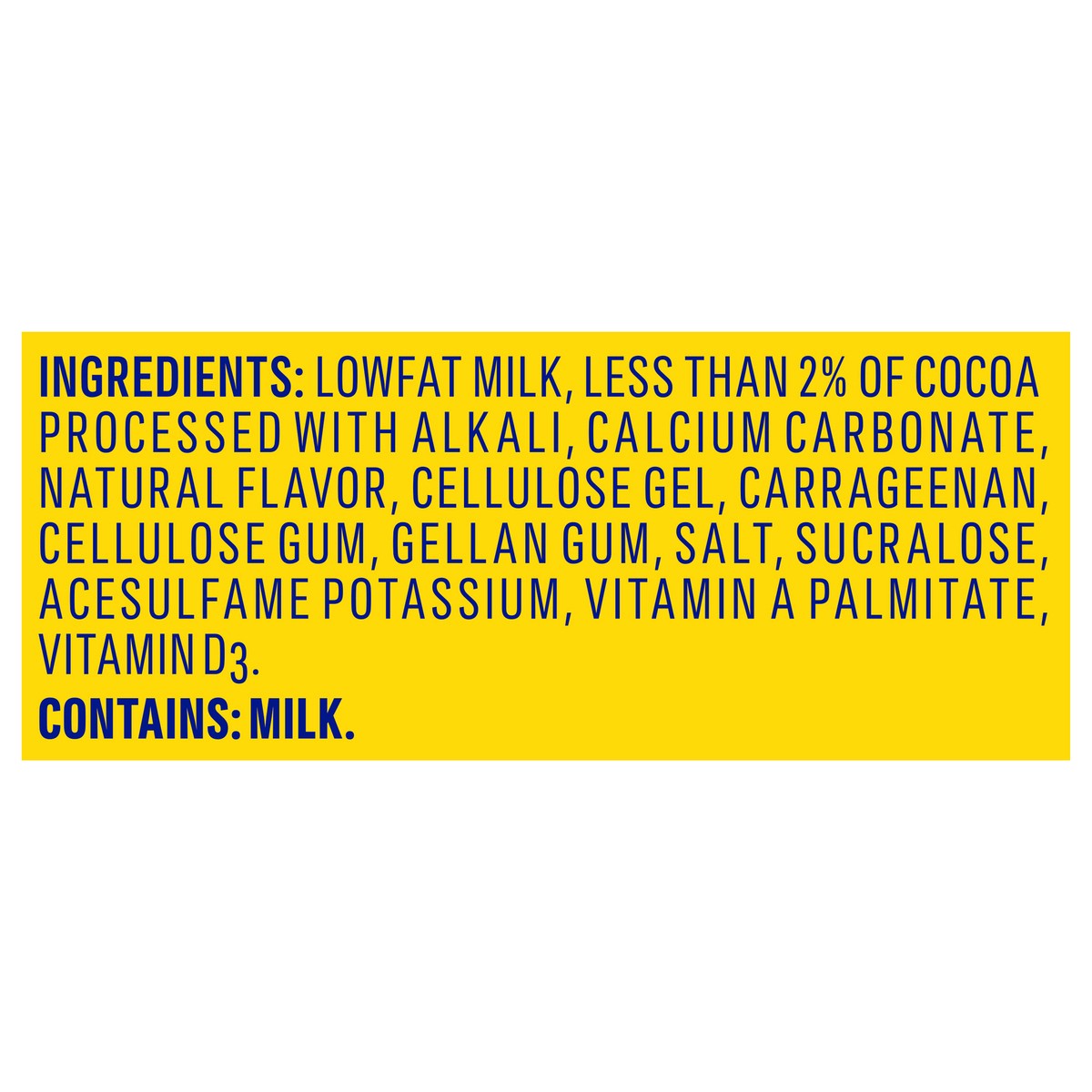 LOWFAT MILK, LESS THAN 2% OF COCOA PROCESSED WITH ALKALI, CALCIUM CARBONATE, NATURAL FLAVOR, CELLULOSE GEL, CARRAGEENAN, CELLULOSE GUM, GELLAN GUM, SALT, SUCRALOSE, ACESULFAME POTASSIUM, VITAMIN A PAL…