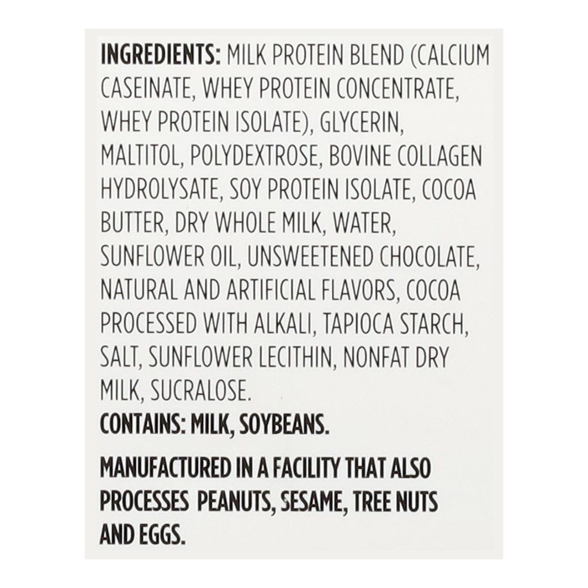 Milk Protein Blend (Calcium Caseinate, Whey Protein Concentrate, Whey Protein Isolate), Glycerin, Maltitol, Polydextrose, Bovine Collagen Hydrolysate, Soy Protein Isolate, Cocoa Butter, Dry Whole Milkā¦