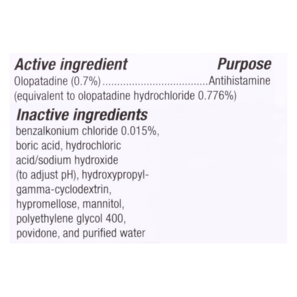 Active Ingredients: Olopatadine (Equivalent to Olopatadine Hydrochloride 0.776%) (0.7 %), Antihistamine. Inactive Ingredients: Benzalkonium Chloride (0.015%), Boric Acid, Hydrochloric acid/Sodium Hydr…