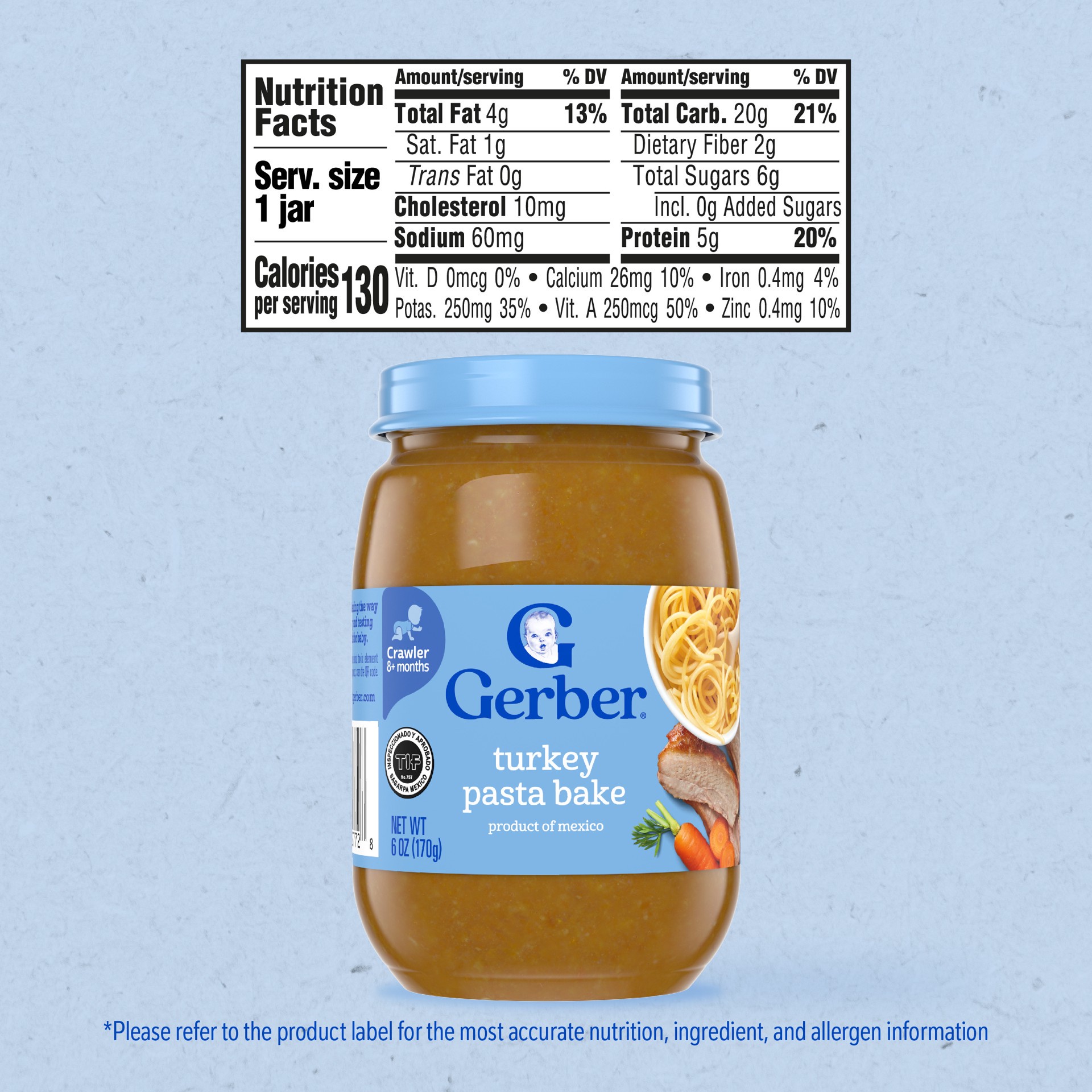 Gerber Turkey Pasta Bake Baby Food Jar is a premium choice for your child and is crafted with wholesome ingredients for your little one. Each turkey jar contains 50% of the daily value of vitamin A an…