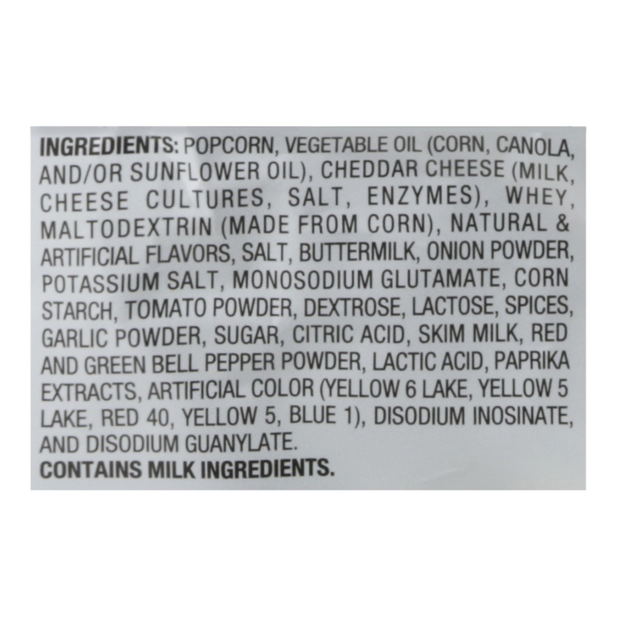 Popcorn, Vegetable Oil (Corn, Canola, and/or Sunflower Oil), Cheddar Cheese (Milk, Cheese Cultures, Salt, Enzymes), Whey, and Less than 2% of the Following: Natural Flavors, Onion Powder, Salt, Butter…