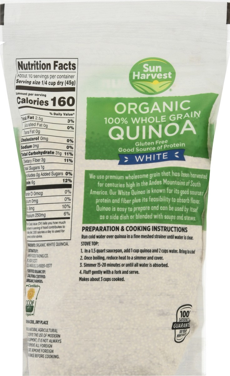 Per 1/4 Cup Dry Serving: 160 calories; 0 g sat fat (0% DV); 0 mg sodium (0% DV); 1 g total sugars. USDA Organic. Certified Organic by California Certified Organic Farmers. Certified CCOF Organic. Glut…