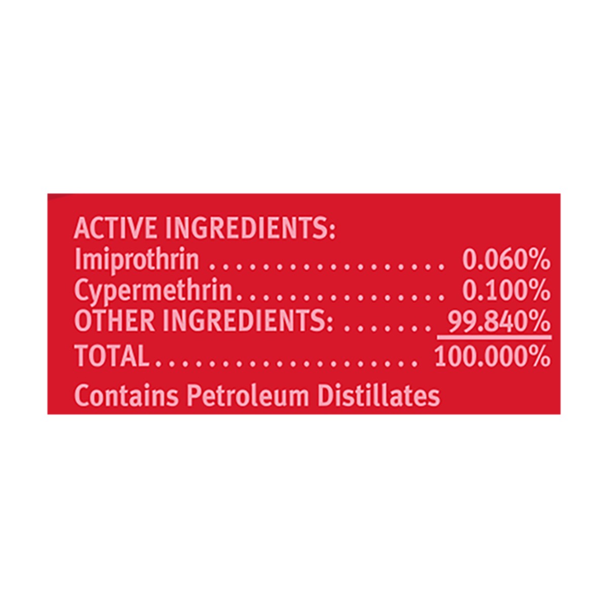 Imiprothrin (0.060%), Cypermethrin (0.100%), other Ingredients (99.840%). Also contains petroleum distillates. For Indoor Residential Use Only.