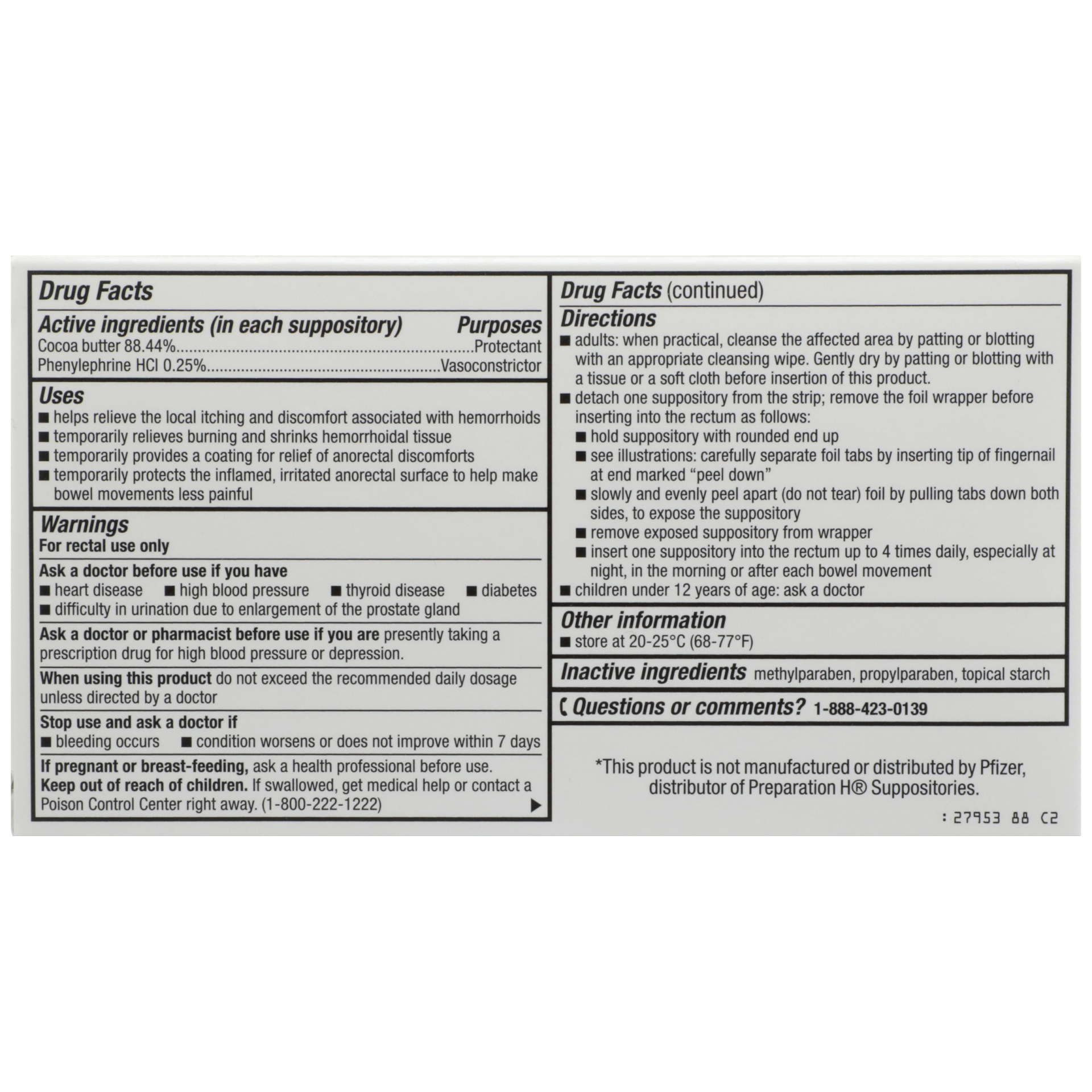 In Each Suppository: Active Ingredients: Cocoa Butter (88.44 %), Protectant; Phenylephrine HCl (0.25 %), Vasoconstrictor. Inactive Ingredients: Methylparaben, Propylparaben, Topical Starch.