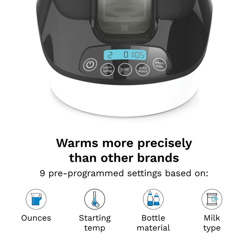 - Warms More Precisely than Other Bottle Warmers: Choose from 9 pre-programmed settings based on your number of ounces, starting temperature, & bottle material which allows the milk warmer to pick the proper warming time, then automatically shuts off when finished