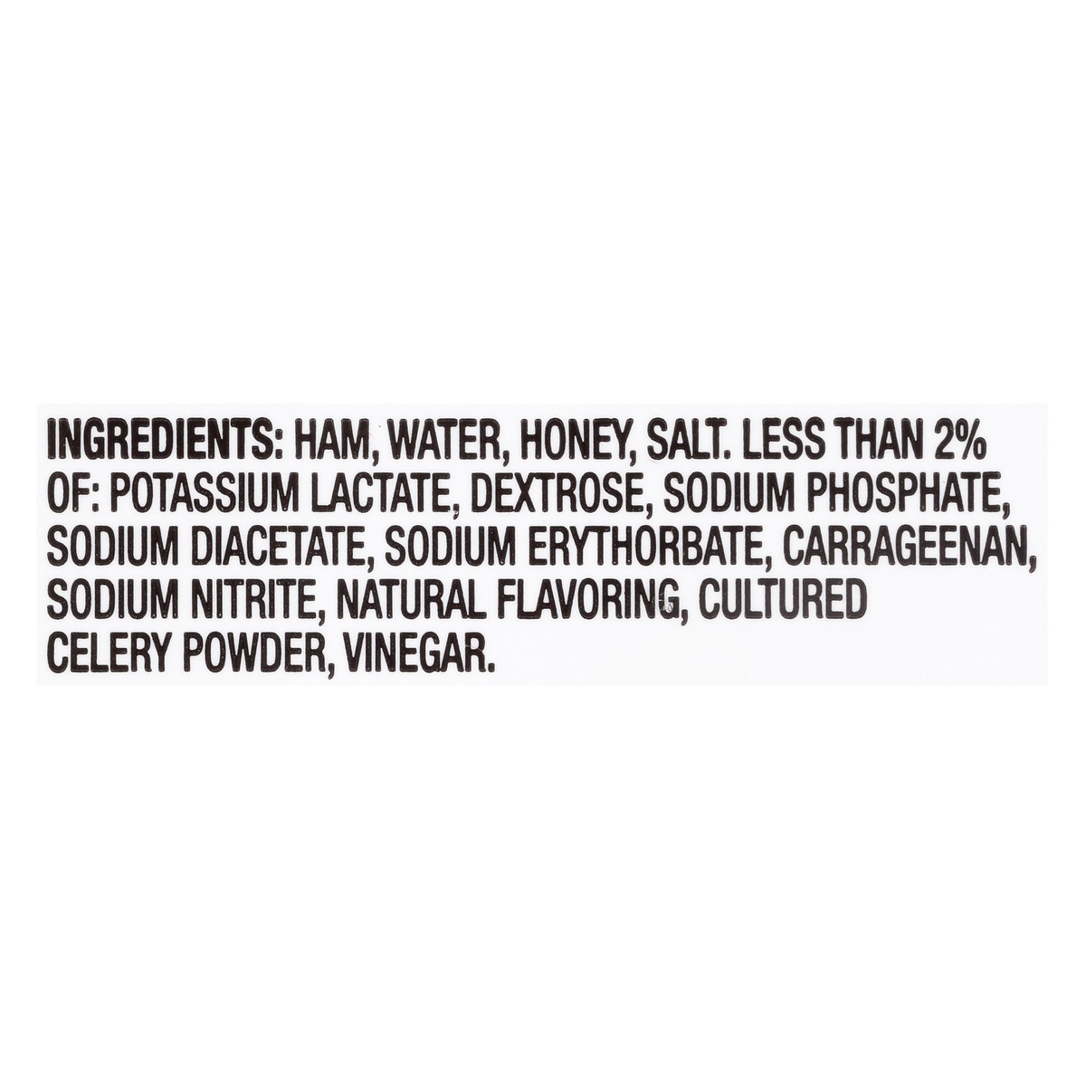 Ham, Water, Honey, Salt, Less than 2% of: Potassium Lactate, Dextrose, Sodium Phosphate, Sodium Diacetate, Sodium Erythorbate, Carrageenan, Sodium Nitrite, Natural Flavoring, Cultured Celery Powder, V…