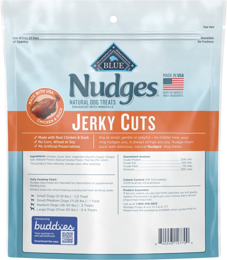 Slowly oven-dried, easy to tear, and packed with protein, these mouthwatering treats are made with real USA chicken. With no artificial flavors or preservatives, BLUE Nudges Jerky Cuts are a healthy t…