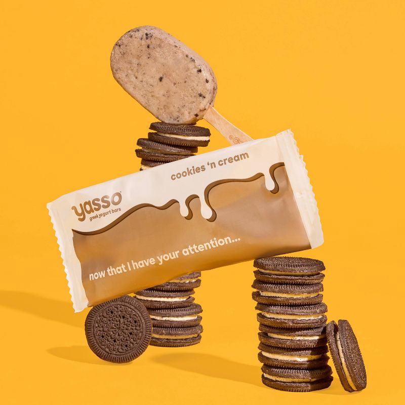 - Yasso Cookies n' Cream Bars are made with ridiculously creamy vanilla crème-flavored Greek yogurt mixed with real chocolate crème-filled cookie pieces