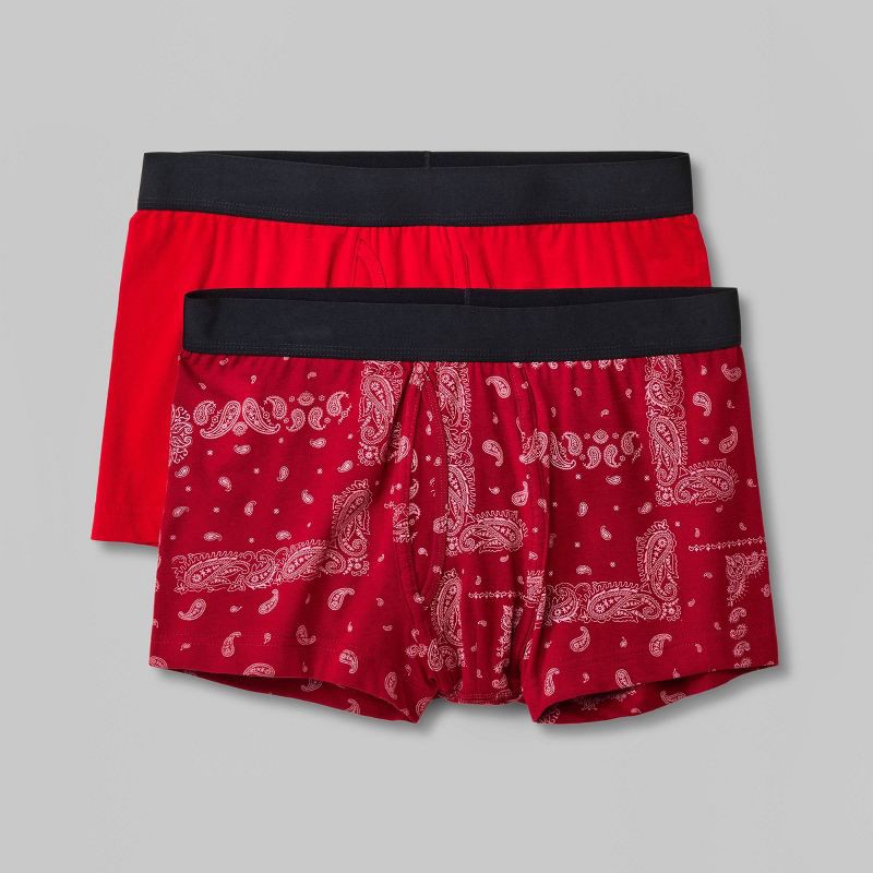 Pack of underwear includes two mid-rise trunks — one with a white bandana print on a maroon background and the other in solid red — framed by black waistbands. They're made of cotton with stretch for …