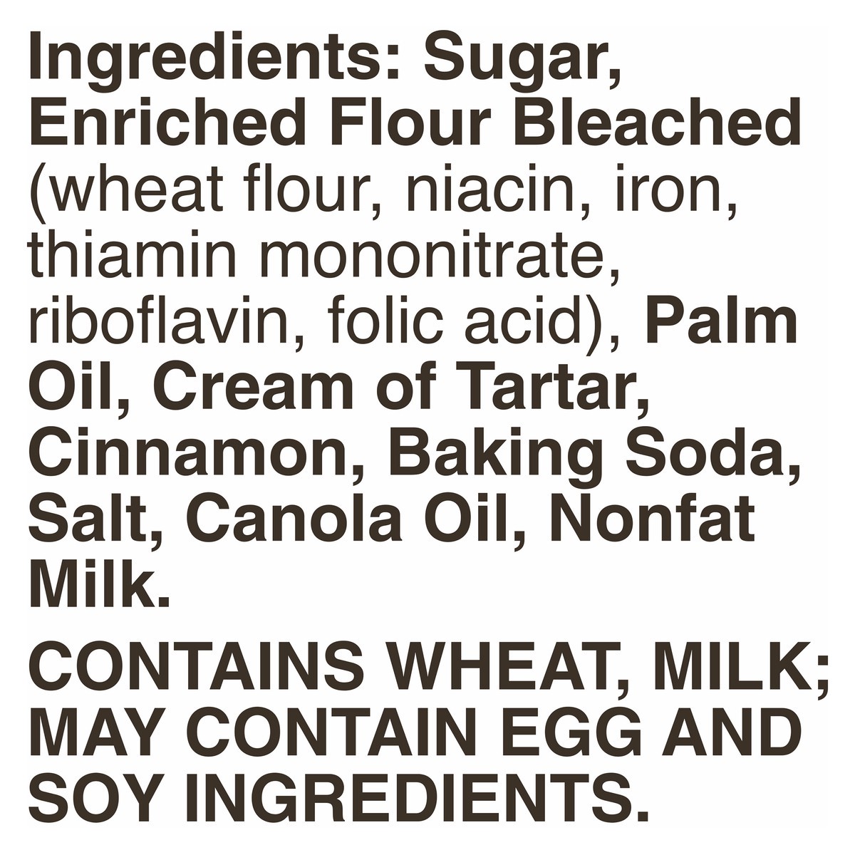 Sugar, Enriched Flour Bleached (Wheat Flour, Niacin, Iron, Thiamine Mononitrate, Riboflavin, Folic Acid), Palm Oil, Cream of Tartar, Cinnamon, Baking Soda, Salt, Canola Oil, Nonfat Milk.