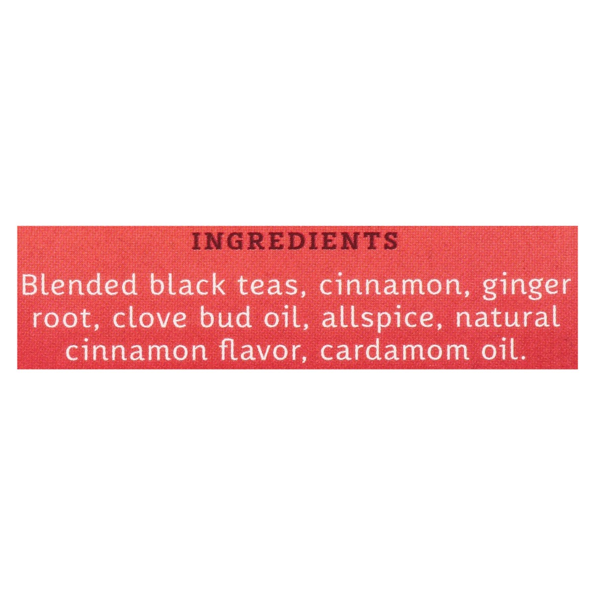 Blended Black Teas, Cinnamon, Ginger Root, Clove Bud Oil, Allspice, Natural Cinnamon Flavor, Cardamom Oil.