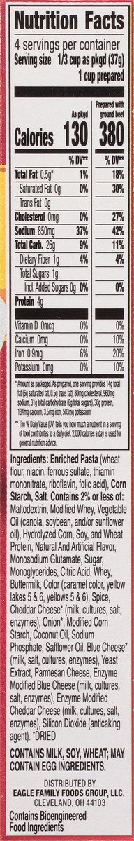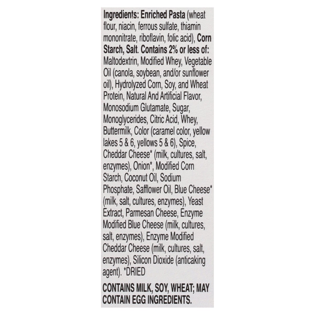 Enriched Pasta (Wheat Flour, Niacin, Ferrous Sulfate, Thiamin Mononitrate, Riboflavin, Folic Acid), Corn Starch, Salt, Contains 2% or Less of: Maltodextrin, Modified Whey, Vegetable Oil (Canola, Soybe…