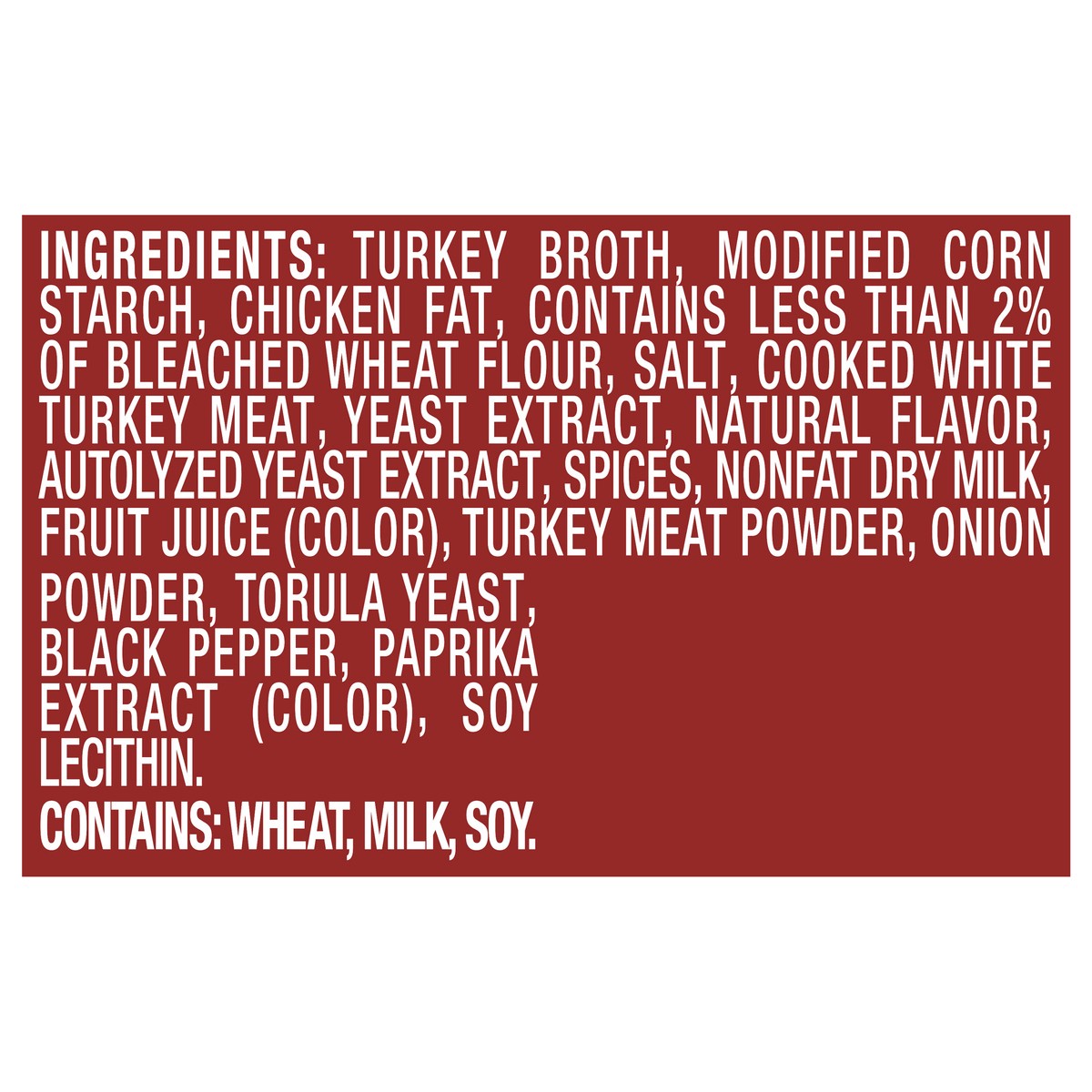 Turkey Broth, Modified Corn Starch, Chicken Fat, Contains Less than 2% of Bleached Wheat Flour, Salt, Cooked White Turkey Meat, Yeast Extract, Natural Flavor, Autolyzed Yeast Extract, Spices, Nonfat D…