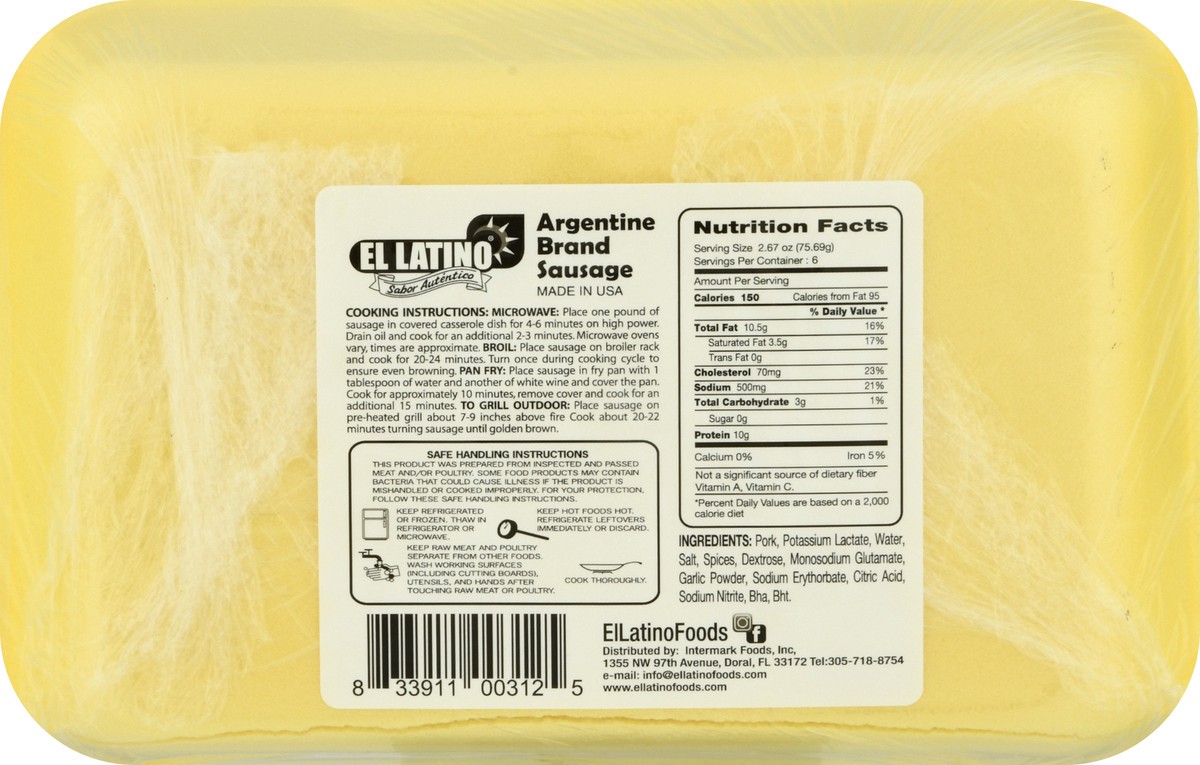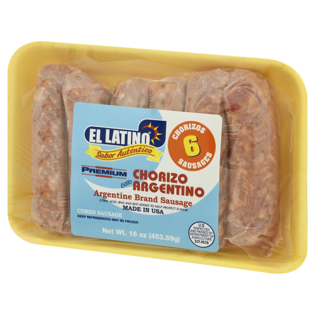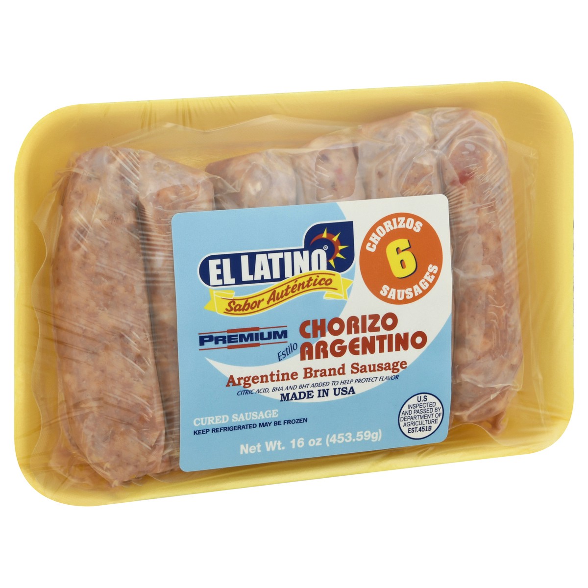 6 chorizos sausages. Cured sausages. Premium. Argentine brand sausage. Citric acid, BHA and BHT added to help protect flavor. U.S. inspected and passed by Department of Agriculture. www.ellatinofoods.…