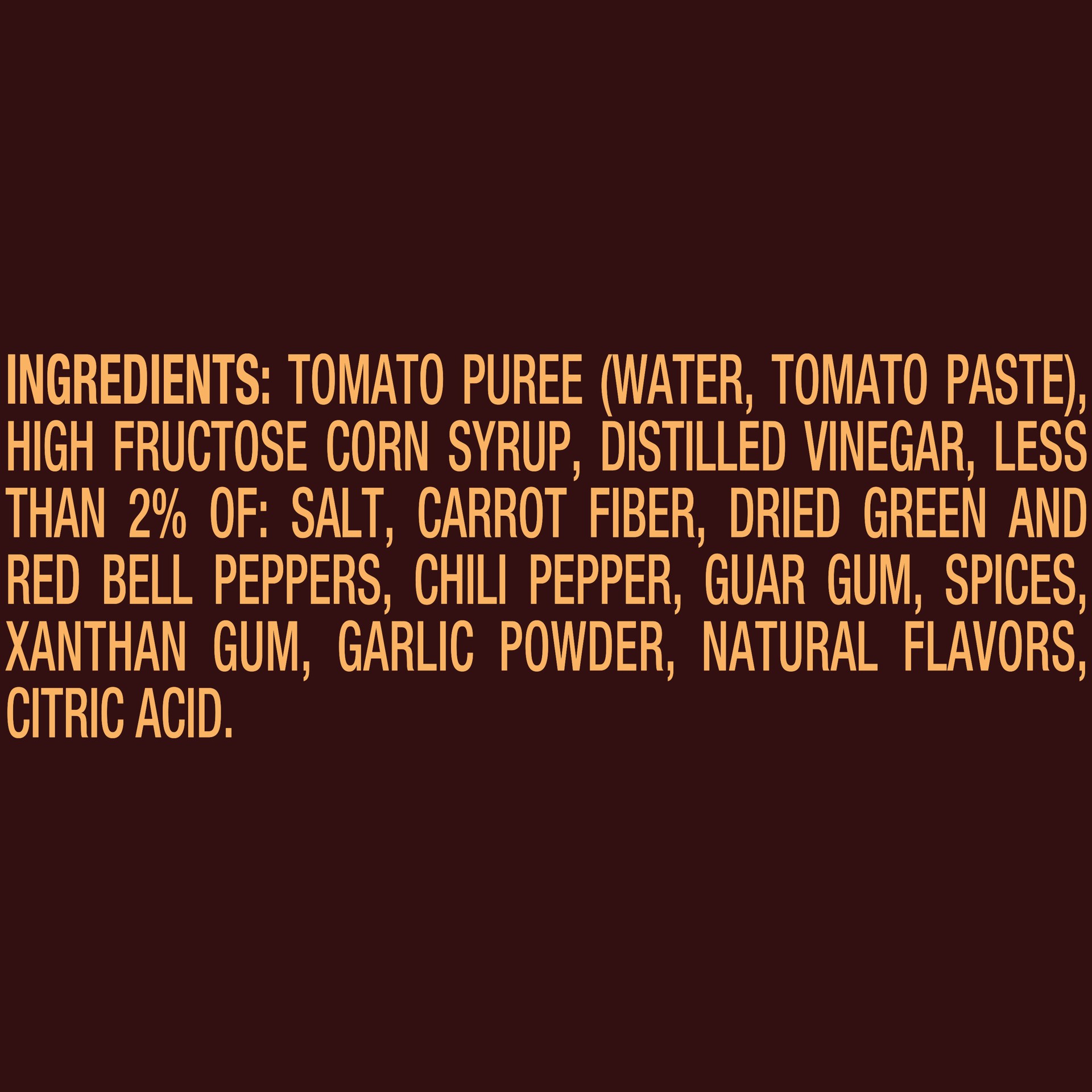 Tomato Puree (Water, Tomato Paste), High Fructose Corn Syrup, Distilled Vinegar, Corn Syrup, Less than 2% of: Salt, Sugar, Carrot Fiber, Dried Green and Red Bell Peppers, Chili Pepper, Guar Gum, Spice…