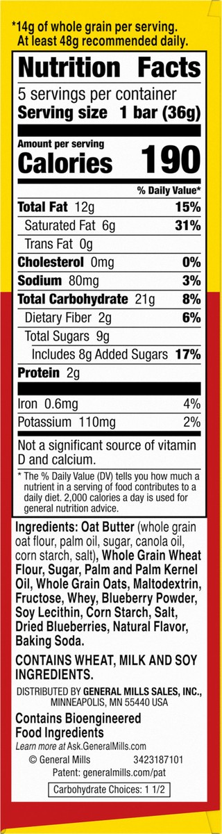 Oat Butter (Whole Grain Oat Flour, Palm Oil, Sugar, Canola Oil, Corn Starch, Salt), Whole Grain Wheat Flour, Sugar, Palm and Palm Kernel Oil, Whole Grain Oats, Maltodextrin, Fructose, Whey, Blueberry …