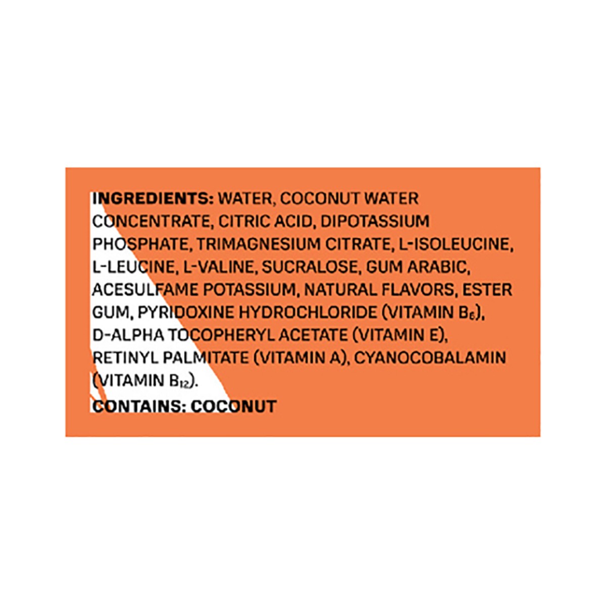 Water, Coconut Water Concentrate, Citric Acid, Dipotassium Phosphate, Trimagnesium Citrate, L-Isoleucine, L-Leucine, L-Valine, Sucralose, Gum Arabic, Acesulfame Potassium, Natural Flavors, Ester Gum, …