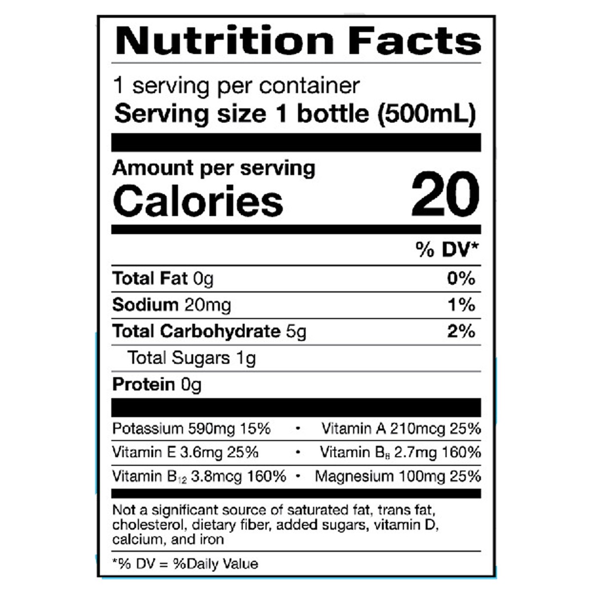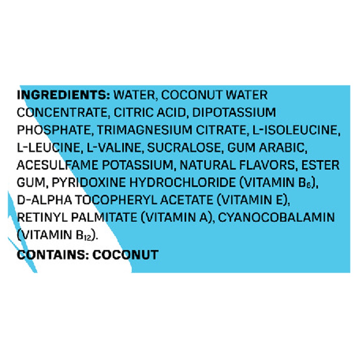 Water, Coconut Water Concentrate, Citric Acid, Dipotassium Phosphate, Trimagnesium Citrate, L-Isoleucine, L-Leucine, L-Valine, Sucralose, Gum Arabic, Acesulfame Potassium, Natural Flavors, Ester Gum, …