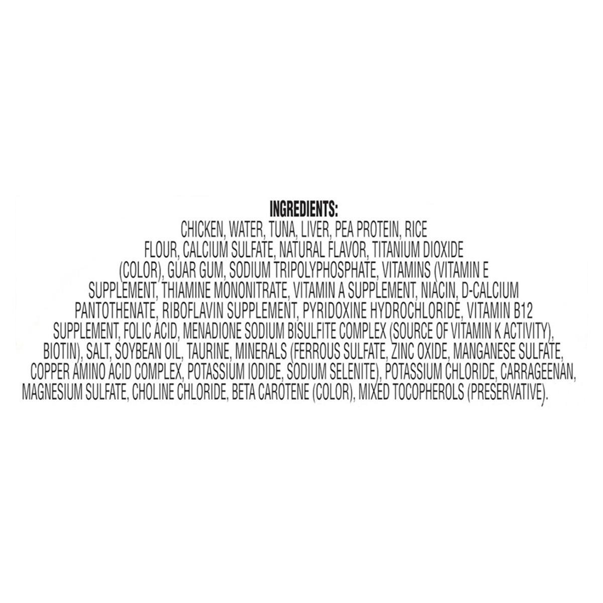 Chicken, Water, Tuna, Liver, Pea Protein, Rice Flour, Calcium Sulfate, Natural Flavor, Titanium Dioxide (Color), Guar Gum, Sodium Tripolyphosphate, Vitamins (Vitamin E Supplement, Thiamine Mononitrate…